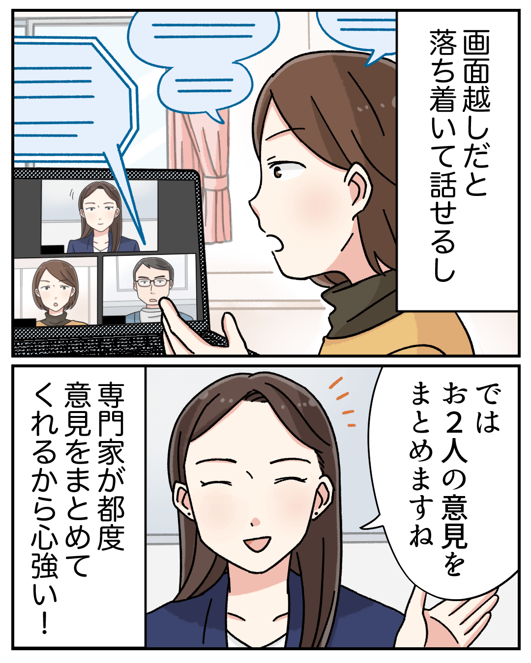 調停技法を学んだ専門家が中立の立場で双方の話を整理しながら進行するため、話し合いがスムーズに進みます。意見もまとまりやすく、安心して話し合いができます。